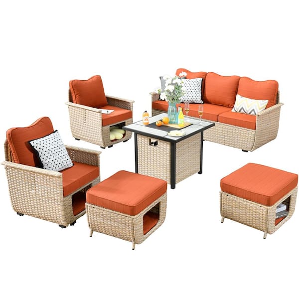 Sierra Beige 6-Piece Wicker Outdoor Multi-Function Patio Conversation Sofa Set with a Fire Pit and Orange Red Cushions