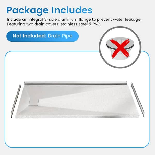 60 in L x 36 in W Threshold-Free Alcove Shower Pan Base w/ Stainless Steel and PV Drain Voard, Wheel Chair Access White