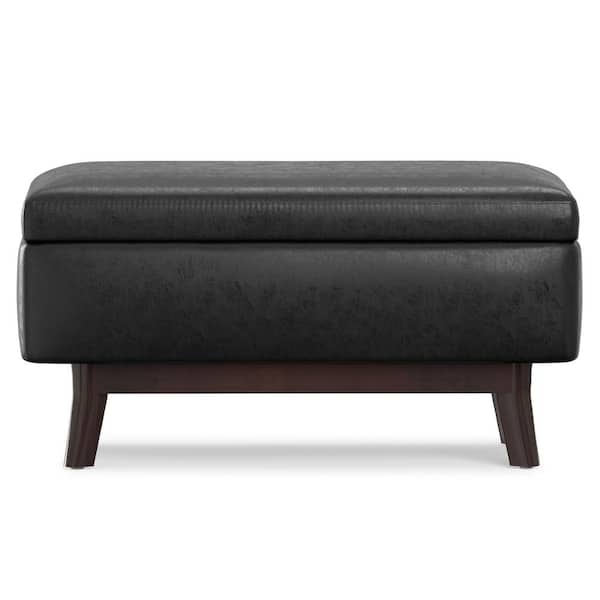 Owen 36 in. Wide Mid Century Modern Rectangle Small Storage Ottoman in Distressed Black Vegan Faux Leather, Assembled