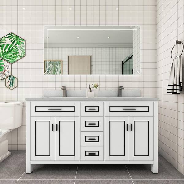 STYLE2 60 in. W x 22 in. D x 35 in. H Ceramic Sink Freestanding Bath Vanity in White with Carrara White Marble Top