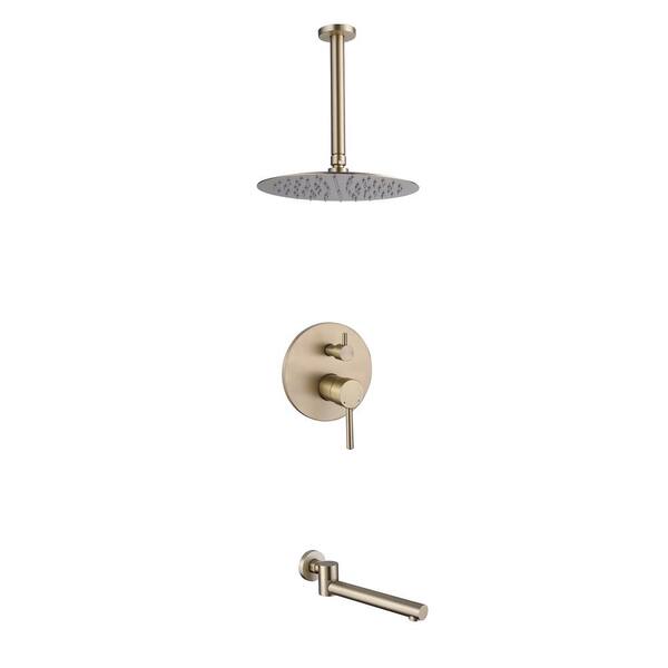 Single Handle 1-Spray 10in Wall Mounted Shower Faucet 2.4 GPM in with Bathtub Spout and Pressure Balance in Brushed Gold