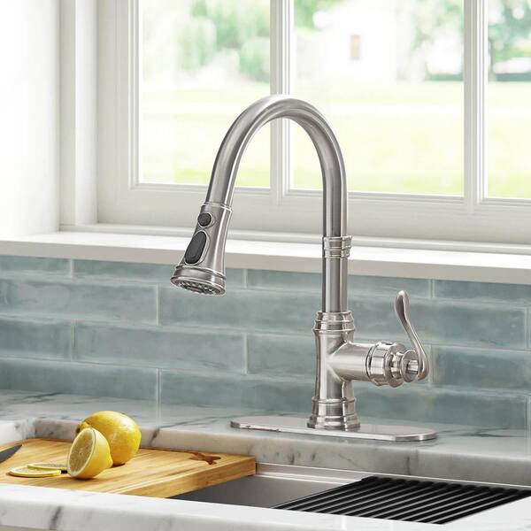 Single-Handle Deck Mount 3 Spray High Arc Pull Down Sprayer Kitchen Faucet with Deck Plate in Brushed Nickel