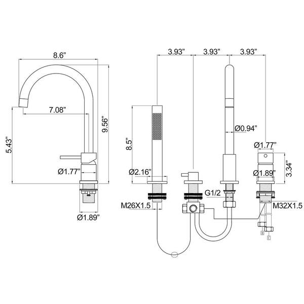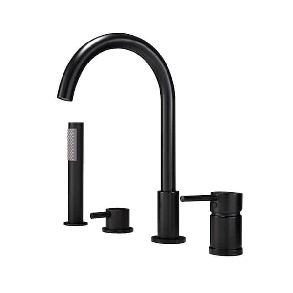 Single-Handle Deck-Mount Roman Tub Faucet with Hand Shower Modern Brass 4 Holes Bathtub Filler in Matte Black