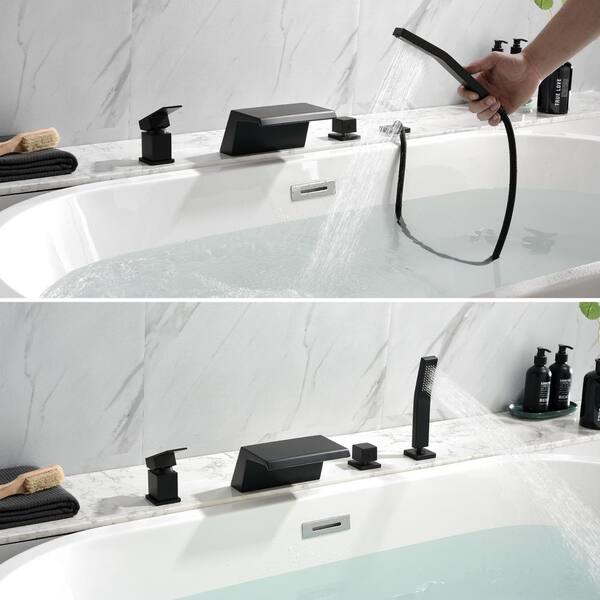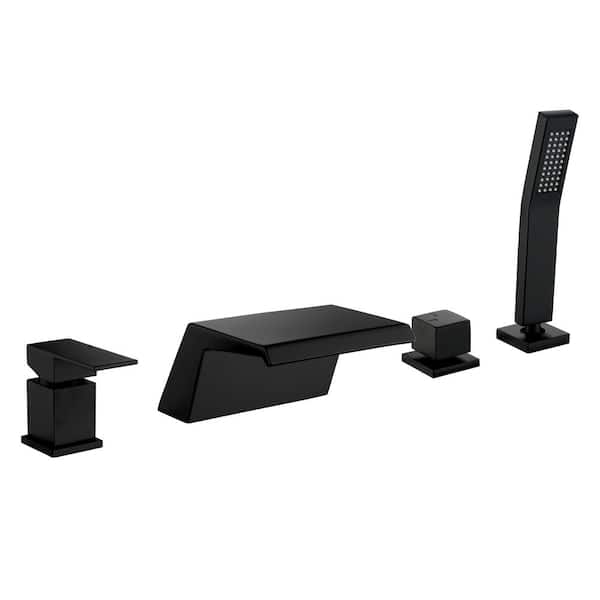 Single-Handle Deck Mount Waterfall Roman Tub Faucet with Hand Shower 2.5 GPM in Matte Black