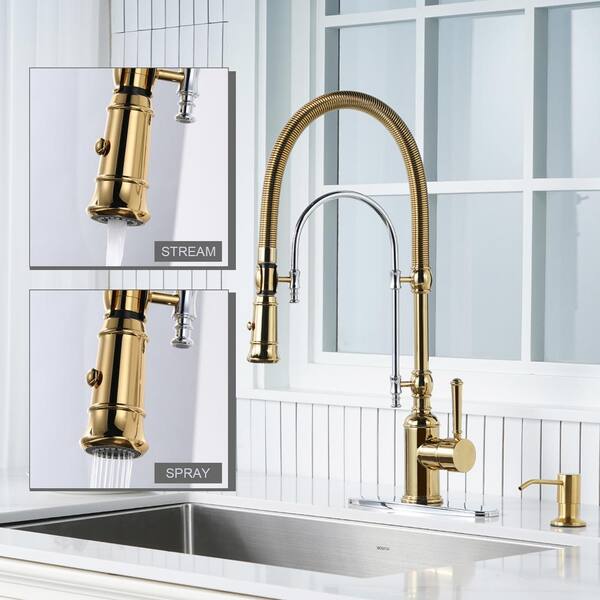 Single Handle Pull Out Sprayer Kitchen Faucet Deckplate Included in Gold and Chrome