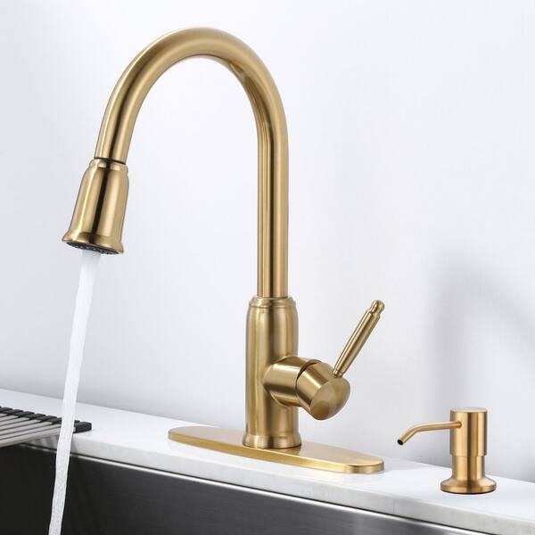 Single Handle Pull Out Sprayer Kitchen Faucet Deckplate Included with Soap Dispenser in Brushed Gold