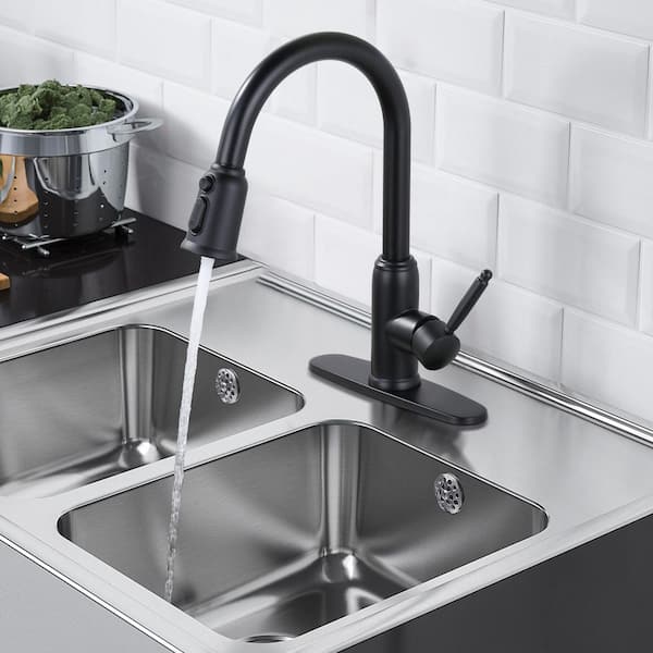 Single Handle Pull Out Sprayer Kitchen Faucet Included Deckplate in Matte Black