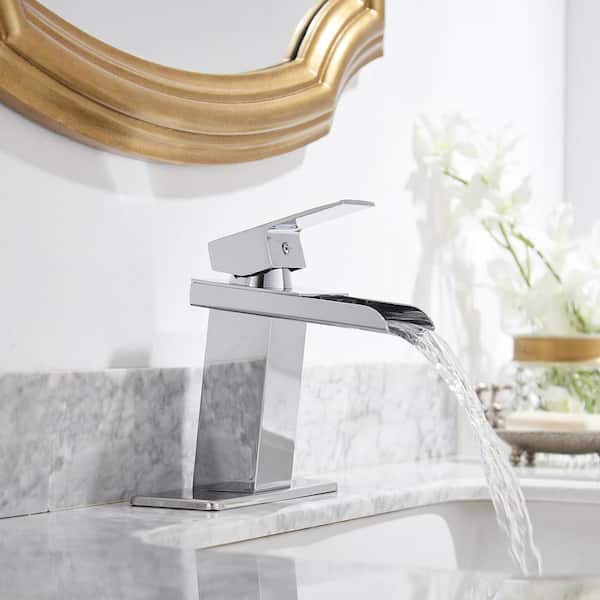 Single Handle Single Hole Bathroom Faucet Waterfall with Deck Plate Pop Up Drain in Chrome