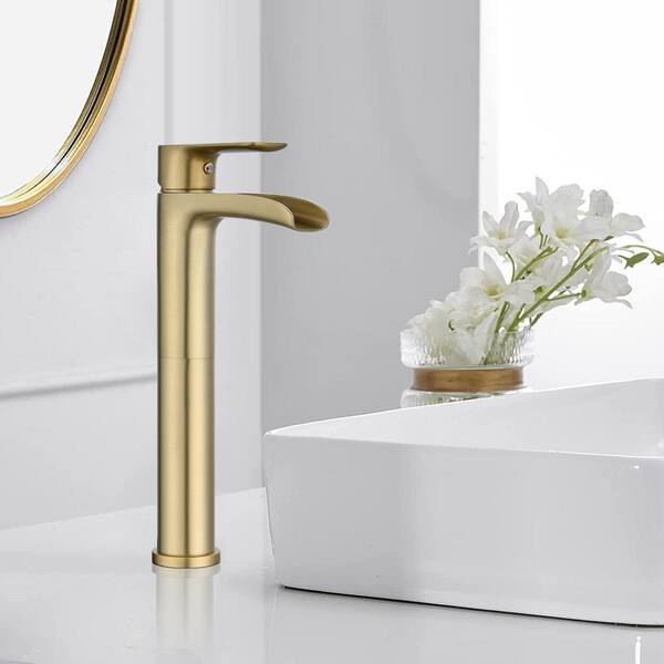 Single Handle Single Hole Bathroom Faucet with Drain Kit Included and Waterfall Spout in Brushed Gold