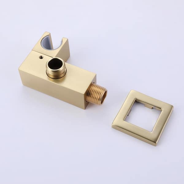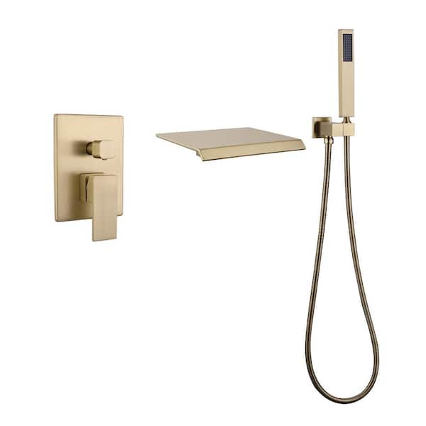 Single-Handle Wall-Mount Roman Tub Faucet with Hand Shower Brass Waterfall Tub Filler with Sprayer in Brushed Gold
