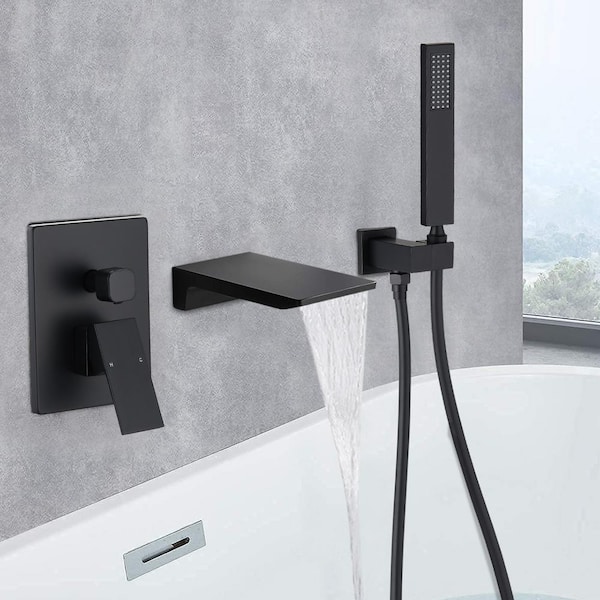 Single-Handle Wall Mount Roman Tub Faucet with Hand Shower and Waterfall in Matte Black