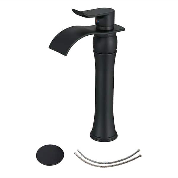 Single Handle Waterfall Bathroom Vessel Sink Faucet with Drain Assembly 1-Hole High Tall Bathroom Faucets in Matte Black