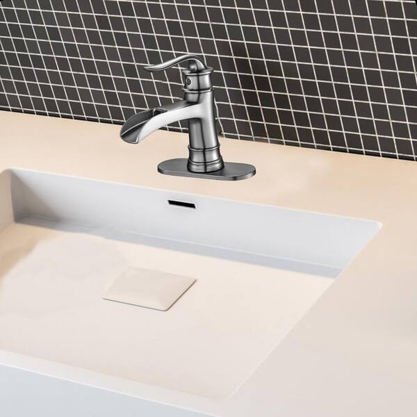 Single Hole Single-Handle Bathroom Faucet With Pop-up Drain Assembly and Waterfall in Brushed Nickel