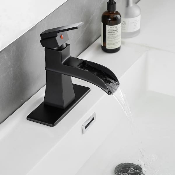 Single Hole Single-Handle Low-Arc Bathroom Faucet With Pop-Up Drain Assembly and Waterfall in Matte Black