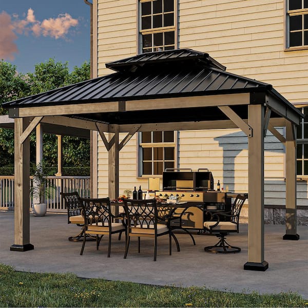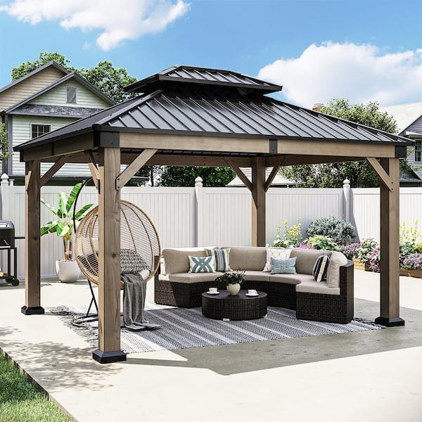 10 ft. x 12 ft. Outdoor Cedar Wood Frame Double Galvanized Steel Roof Gazebo with Ceiling Hook