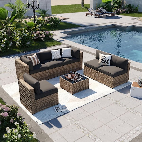 Brown 8-Piece Wicker Rattan Outdoor Sectional Set with 50000 BTU Gas Fire Pit Table and Black Cushions, Coffee Table