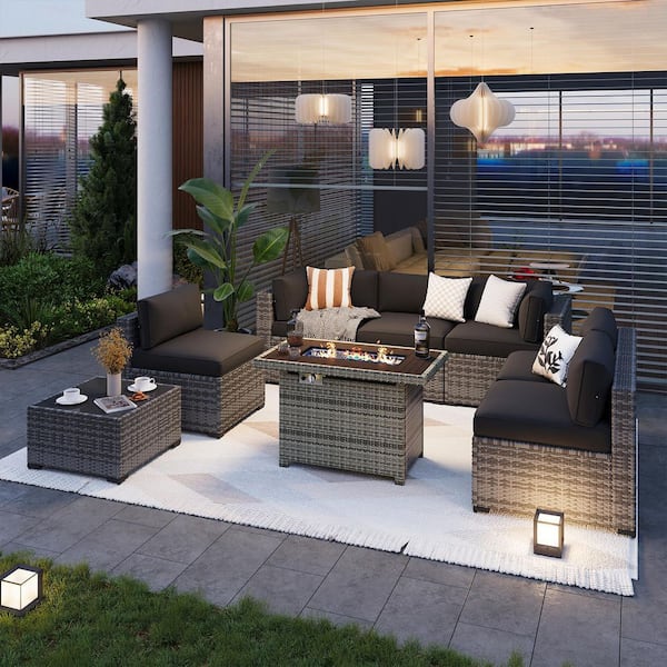 Gray 8-Piece Wicker Rattan Outdoor Sectional Set with 50000 BTU Gas Fire Pit Table and Black Cushions, Coffee Table