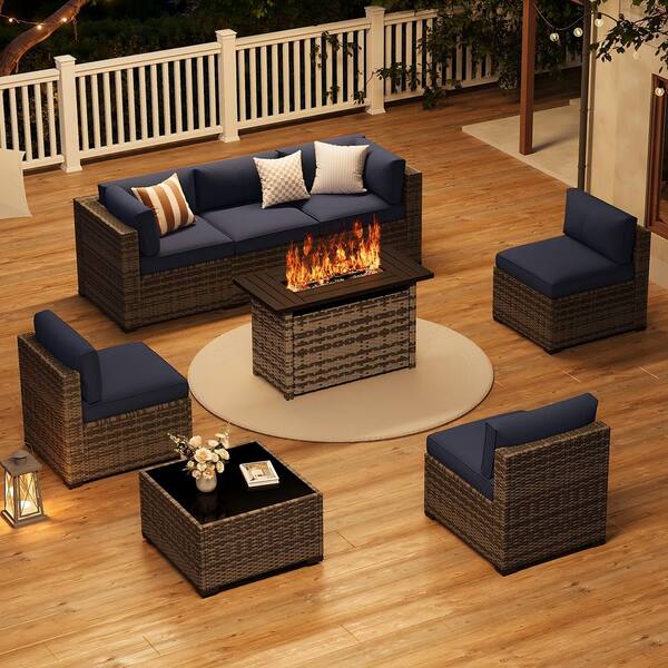 Gray 8-Piece Wicker Rattan Outdoor Sectional Set with 50000 BTU Gas Fire Pit Table and Blue Cushions, Coffee Table