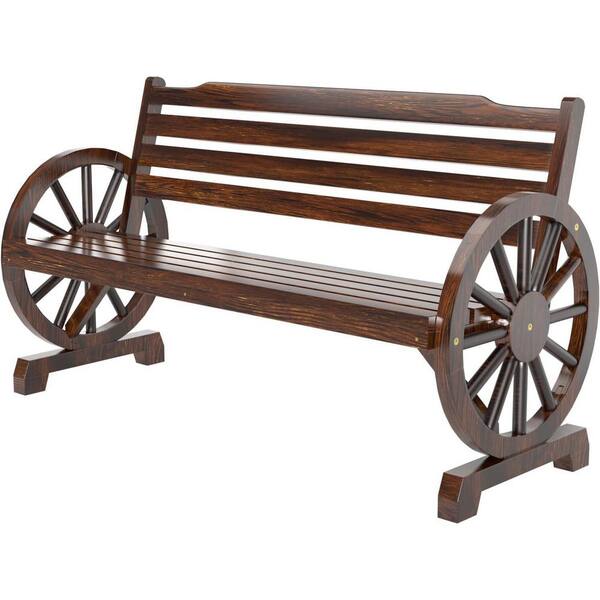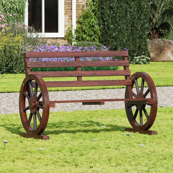 • Rustic wooden wheel bench adds a distinctive element