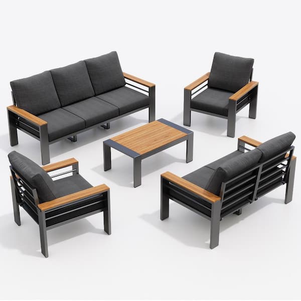 Stylish 5-Piece Black Aluminum Patio Seating Set with Comfortable Dark Gray Cushions and a Matching Table