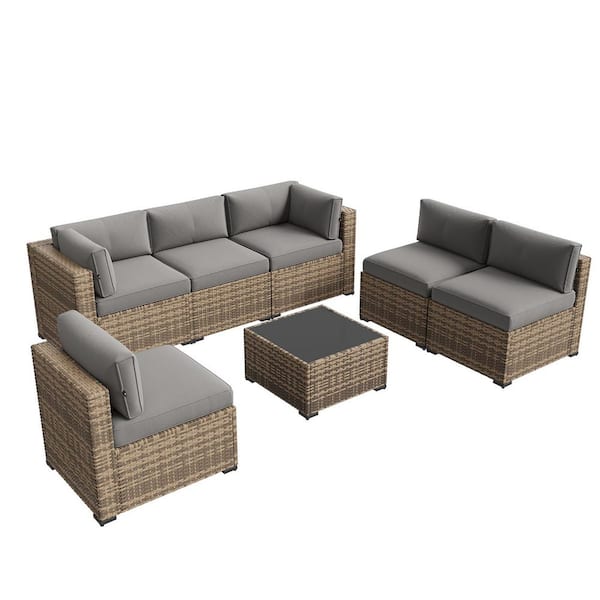 Yellow 7-Piece Wicker Rattan Outdoor Sectional Set with Blue Cushions, Coffee Table and Set Cover