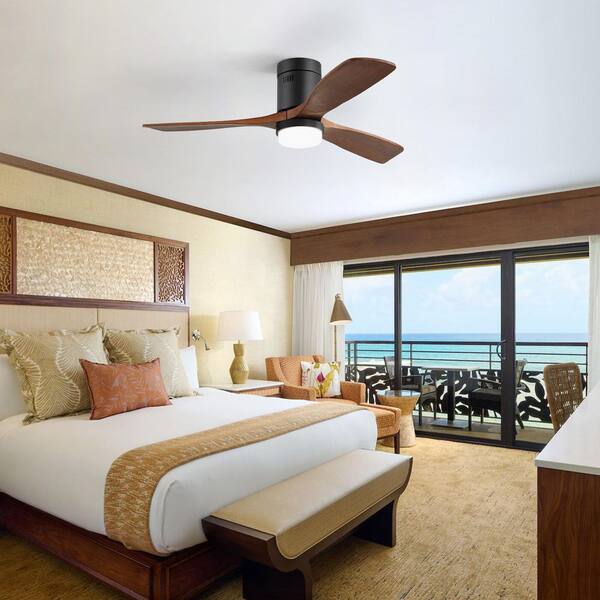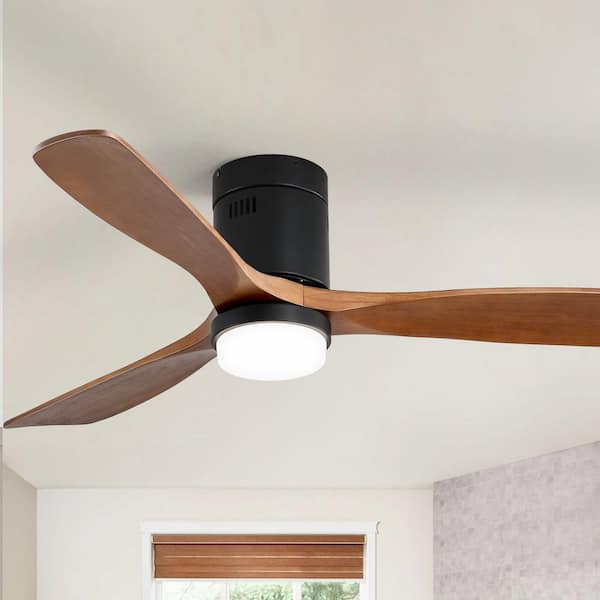 52 in.Indoor/Outdoor Flush Mount Black LED Ceiling Fan with 3-Reversible Wood Blades, 6-Speed DC Remote Control
