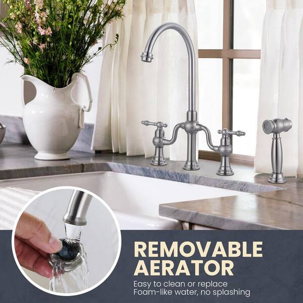 Solid Brass Double Handle High-Arc Deck Mounted Bridge Kitchen Faucet with Side Sprayer in Brushed Nickel