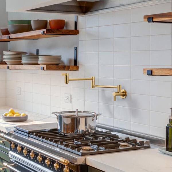 Solid Brass Wall Mounted Pot Filler Faucet with Double Joint Swing Arms, Commercial Kitchen Pot Faucet in Gold