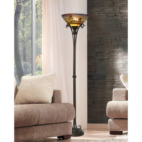 Solvang 69 in. Antique Bronze Floor/Torchiere Lamp with Hand Painted Art Glass Shade