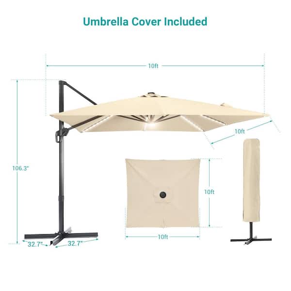 10 ft. Aluminum Pole Cantilever Solar LED Patio Umbrella 360° Rotation and Infinite Canopy Angle Adjustment in Sand