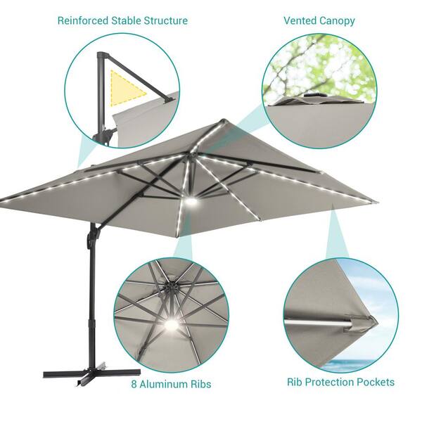 11.5 ft. x 9 ft. Premium Aluminum Pole Cantilever Solar LED Patio Umbrella 360° Rotation, Gray