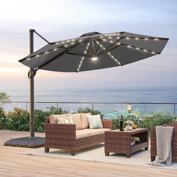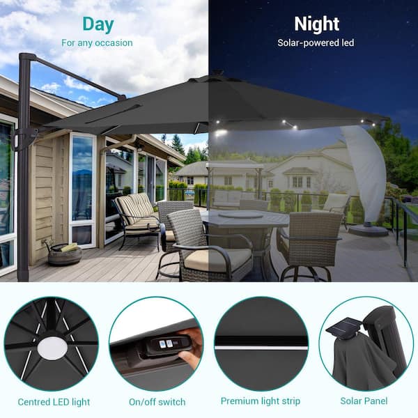 11 ft. Solar LED Round Aluminum Cantilever Outdoor Patio Umbrellas with Base in Anthracite