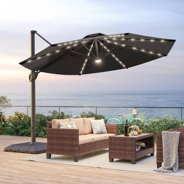 11 ft. Solar LED Round Aluminum Cantilever Outdoor Patio Umbrellas with Base in Black