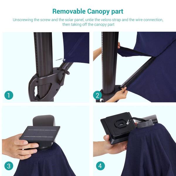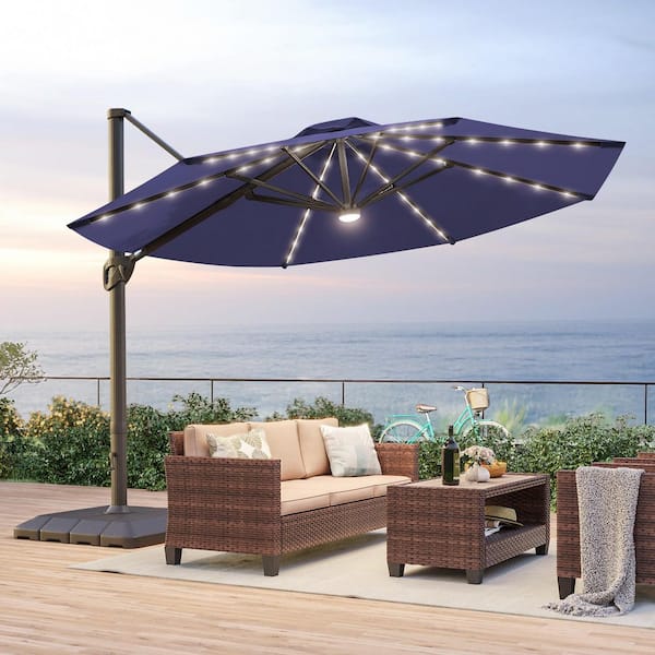 11 ft. Solar LED Round Aluminum Cantilever Outdoor Umbrellas with Base Stand in Navy Blue