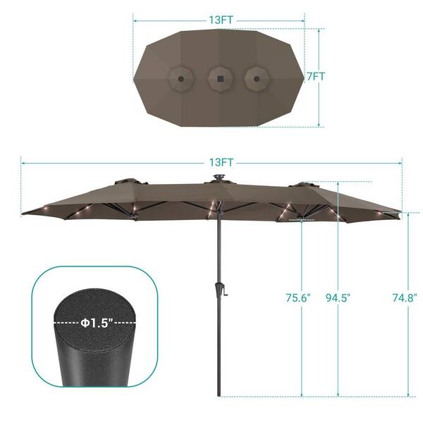 13 ft. x 7.2 ft. Steel Solar-Powered Double-Sided Market Patio Umbrella with Large Canopy Outdoor Table Umbrella Taupe