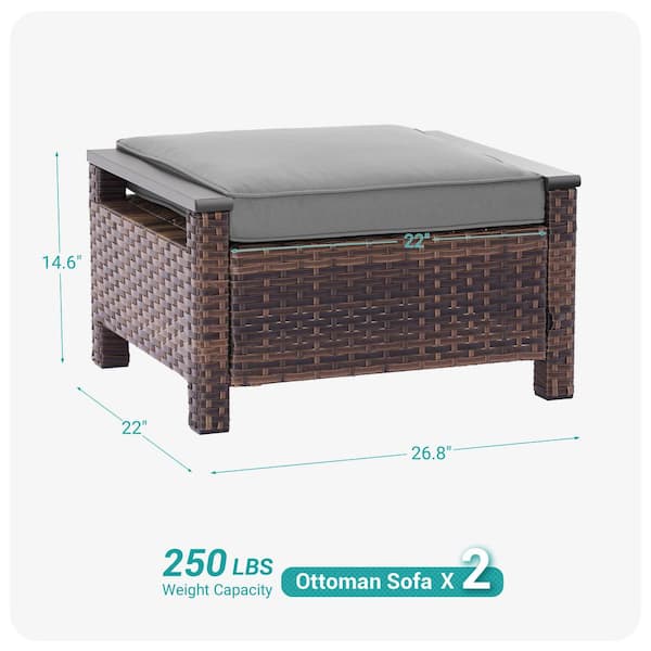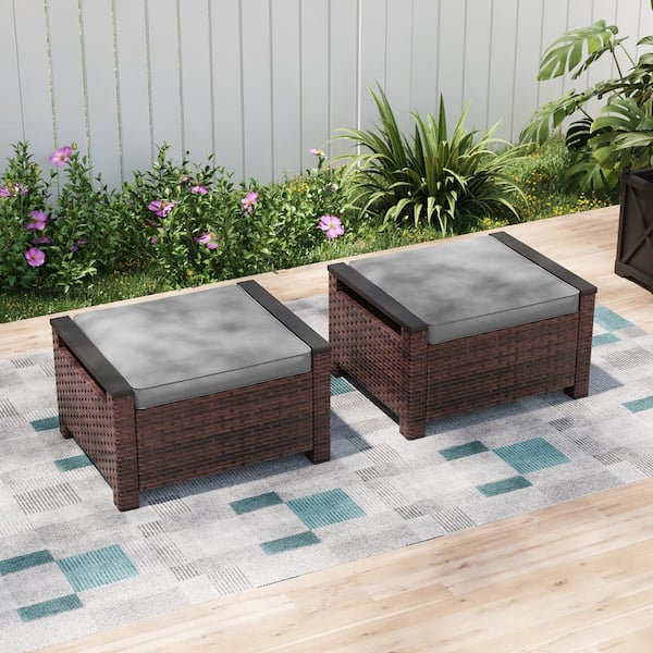 2-Piece Metal Outdoor Ottomans All-Weather Brown Wicker Solution-Dyed Fabric Gray Cushion