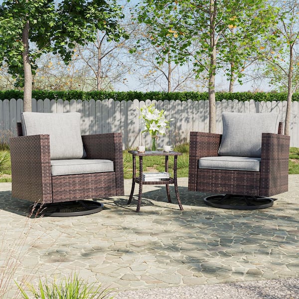 3-Piece Brown Wicker Outdoor Swivel Rocking Chairs Patio Bistro Set with Side Table Linen Grey Cushion