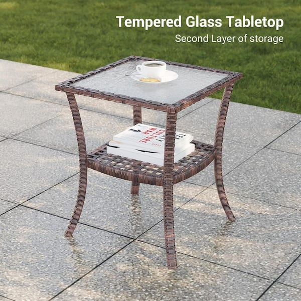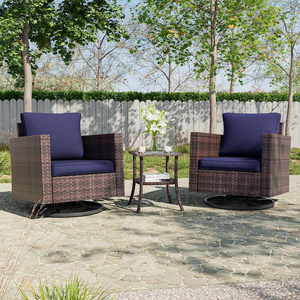 3-Piece Brown Wicker Outdoor Swivel Rocking Chairs Patio Bistro Set with Side Table Navy Blue Cushion