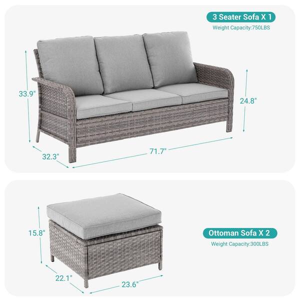 3-Pieces Outdoor Patio Conversation Set with 3-Seater Sofa and Ottoman Gray Wicker with Linen Gray Cushion