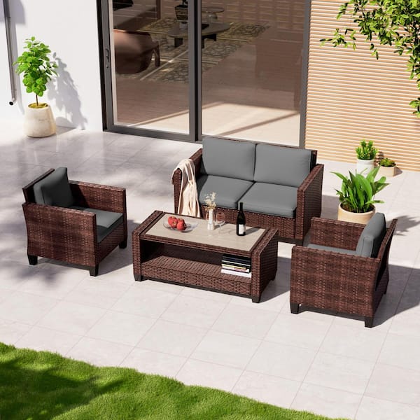 4-Pieces Patio Conversation Set Loveseat Sofa with Coffee Table All-Weather Brown Wicker with Gray Cushions