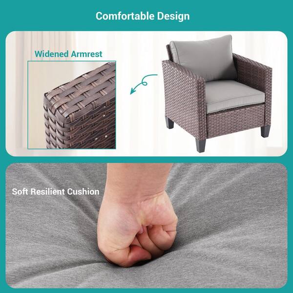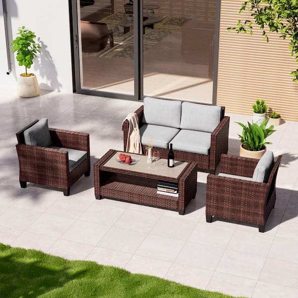 4-Pieces Patio Conversation Set Loveseat Sofa with Coffee Table All-Weather Brown Wicker with Linen Gray Cushions