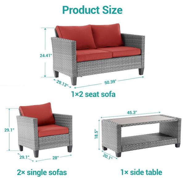 4-Pieces Patio Conversation Set Loveseat Sofa with Coffee Table All-Weather Gray Wicker with Rust Red Cushions