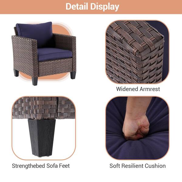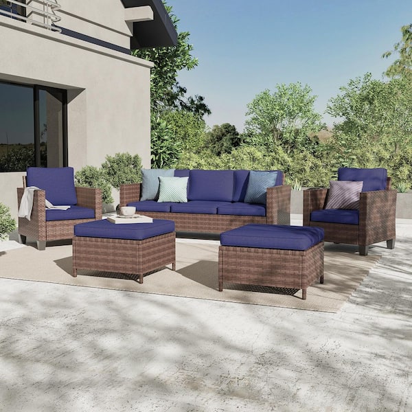 5-Piece Brown Wicker Patio Sofa Set Outdoor Conversation Set with 3-Seat Sofa Ottomans, Navy Blue Cushions