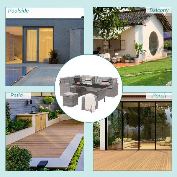 5-Piece Patio Dining Sofa Set Widened Back and Arm PE Rattan Outdoor Furniture Set, Linen Grey