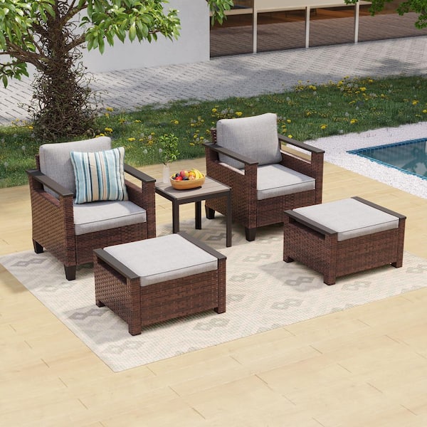 5-Pieces Brown PE Wicker Patio Conversation Set with Side Table and Ottomans with Washable Linen Grey Cushion