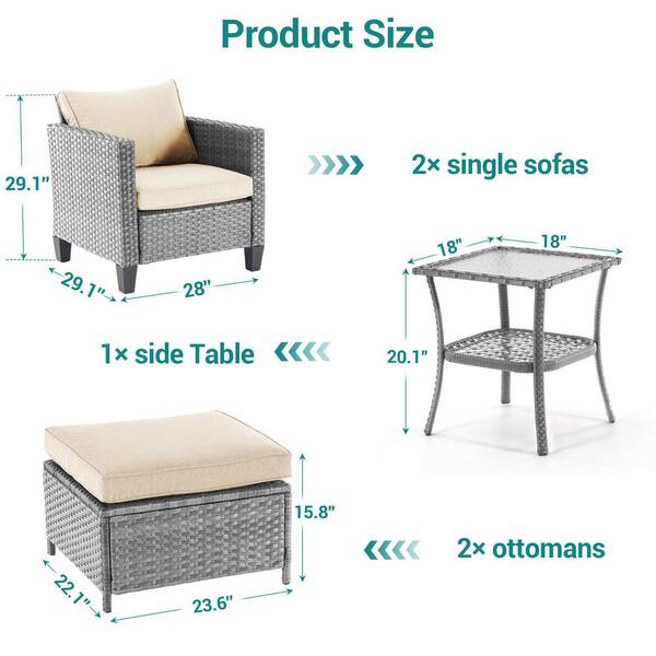 5-Pieces Patio Conversation Set with Side Table, Outdoor Armchair and Ottomans Gray Wicker with Beige Cushions
