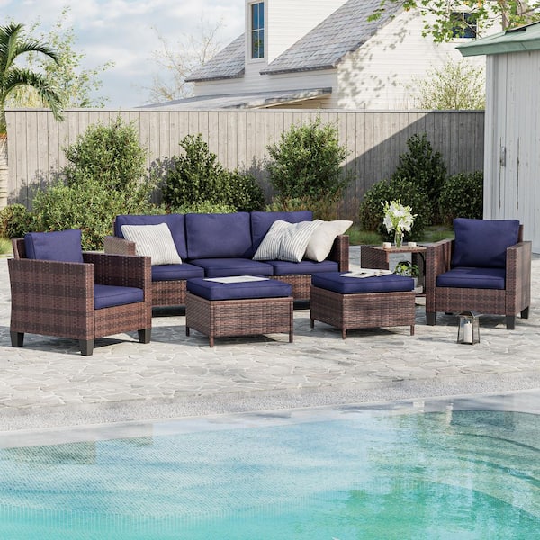 6-Piece Patio Sofa Set Brown Wicker Outdoor Furniture Set with Coffee Table, Navy Blue