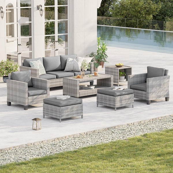 7-Piece Patio Conversation Set Grey Wicker Outdoor Furniture Set Three-Seat Sofa Thickening Cushions, Gray