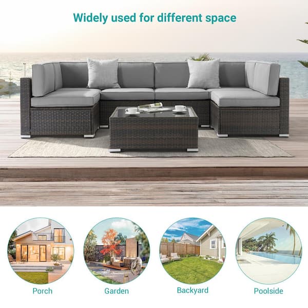 7-Piece Rattan Wicker Patio Conversation Sectional Seating Set with Gray Cushions