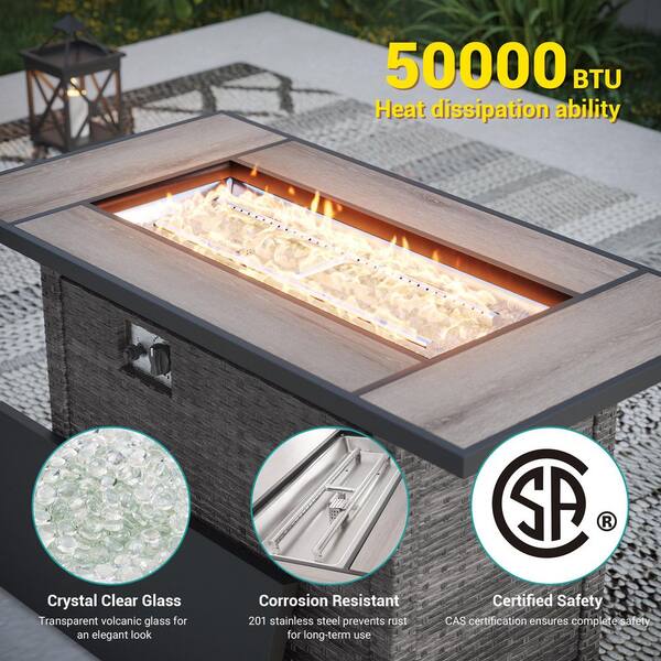 7-Pieces Patio Conversation Set with Rectangle Fire Pit Table and Loveseat Sofa, Gray Wicker with Navy Blue Cushions